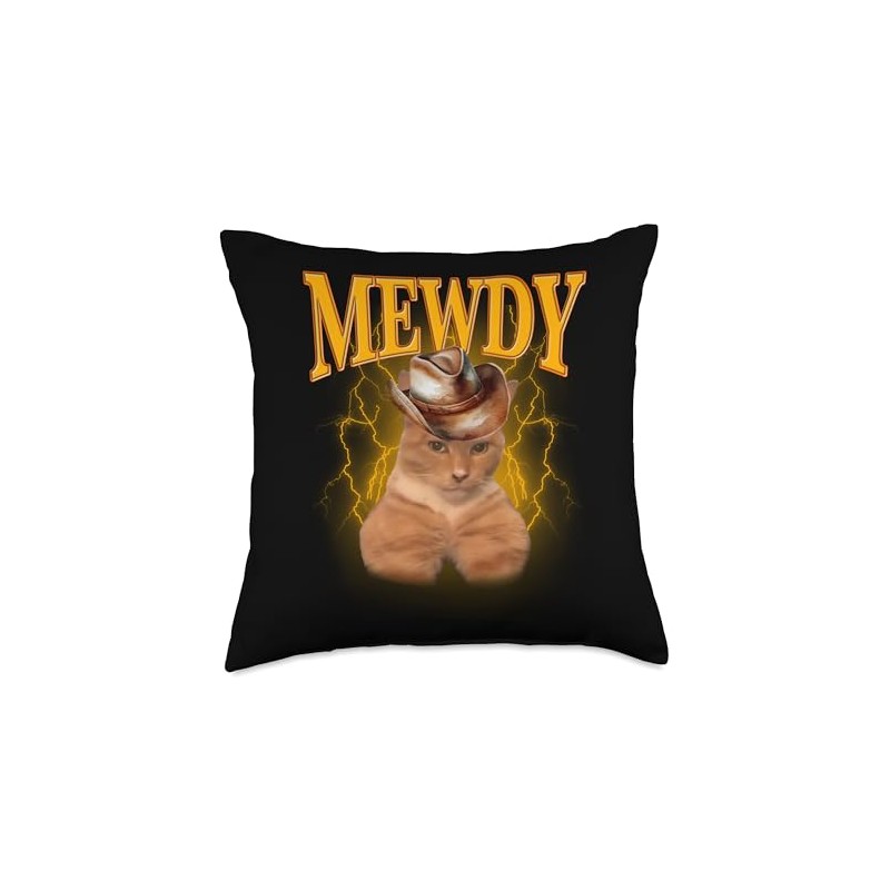 Mewdy Meme - Funny Mewing Cat Cowboy Hat Vintage Throw Pillow