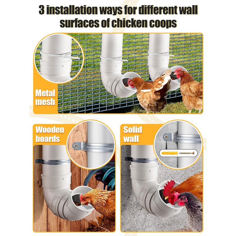 - CHICKEN FEEDERS NO WASTE: The feeder is installed on the wall, the chickens just stick their heads in and get constant food, instead of standing on the food and pulling the food everywhere with feet, minimizing food waste and feed costs.