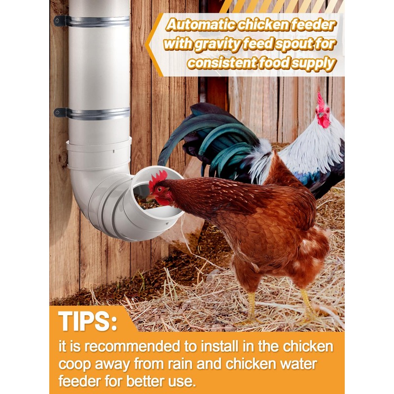 - EASY TO INSTALL & FILL: Our chicken feeder kit can only be used inside the chicken coop, you just need to follow the steps on the instructions, open the top lid and put in the chicken food. Note: Choose a wall away from rain and water feeder to avoid food damage by water.