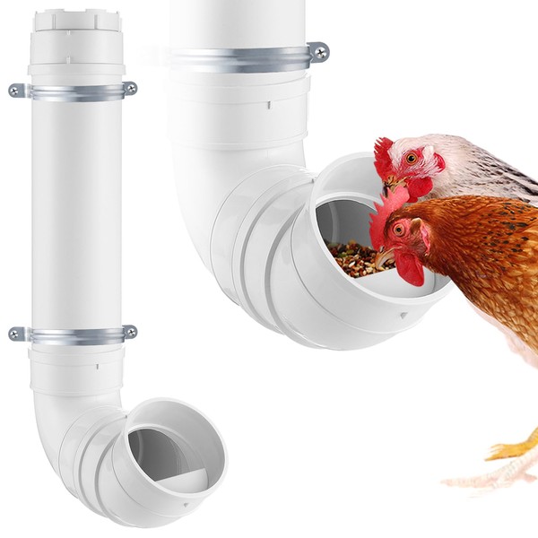 - HIGH QUALITY THICKENED PVC: The chicken coop feeder is made of thickened PVC, safe and durable, the wall thickness of tube is about 0.09in, wear-resistant, not easy to damage and deform, easy to clean, can keep the food dry and fresh.