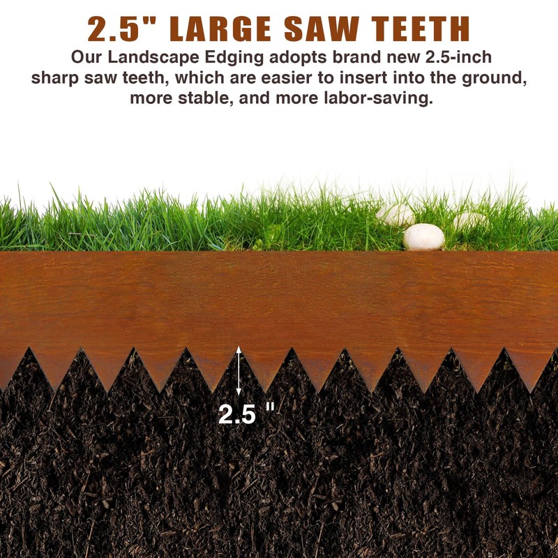 - HEAVY DUTY CORTEN STEEL MATERIAL - Our metal garden landscape edging is made of heavy-duty corten steel for durability. The unique large tooth design ensures stability and strength, providing lasting support for your outdoor space. Take care to wear gloves during use