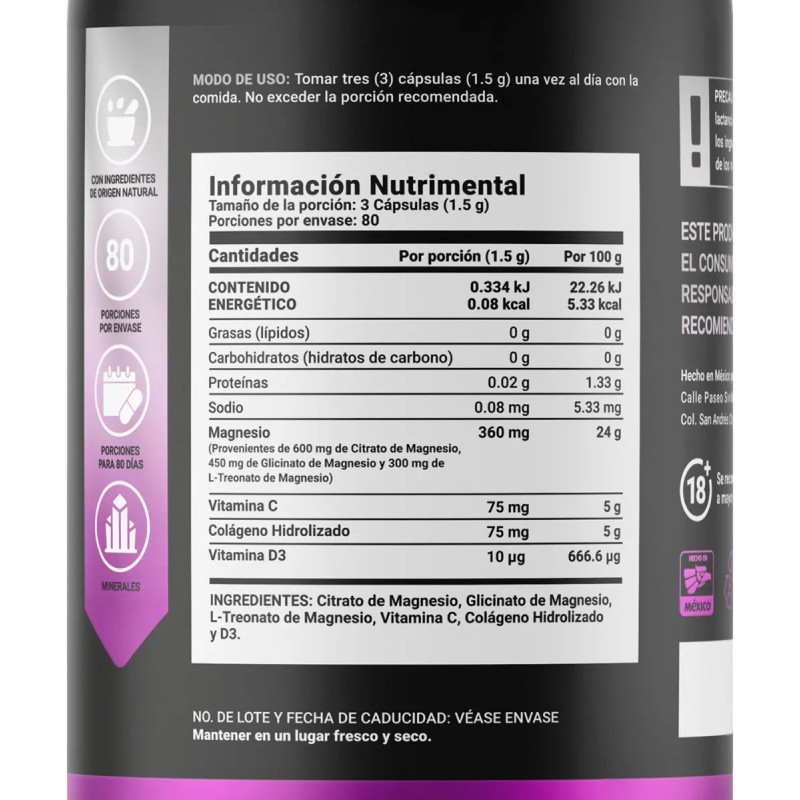Fórmula avanzada con 3 tipos de magnesio (citrato, malato y glicinato) para mejorar el sueño, calmar el estrés y prevenir calambres musculares.