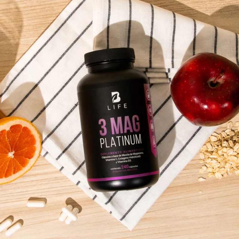 3-Mag Platinum de B-Life es un suplemento premium que combina tres formas de magnesio científicamente seleccionadas por su alta absorción y eficacia: citrato, glicinato y malato. Cada uno actúa en diferentes funciones corporales, ofreciendo beneficios completos para el sistema nervioso, muscular y energético.