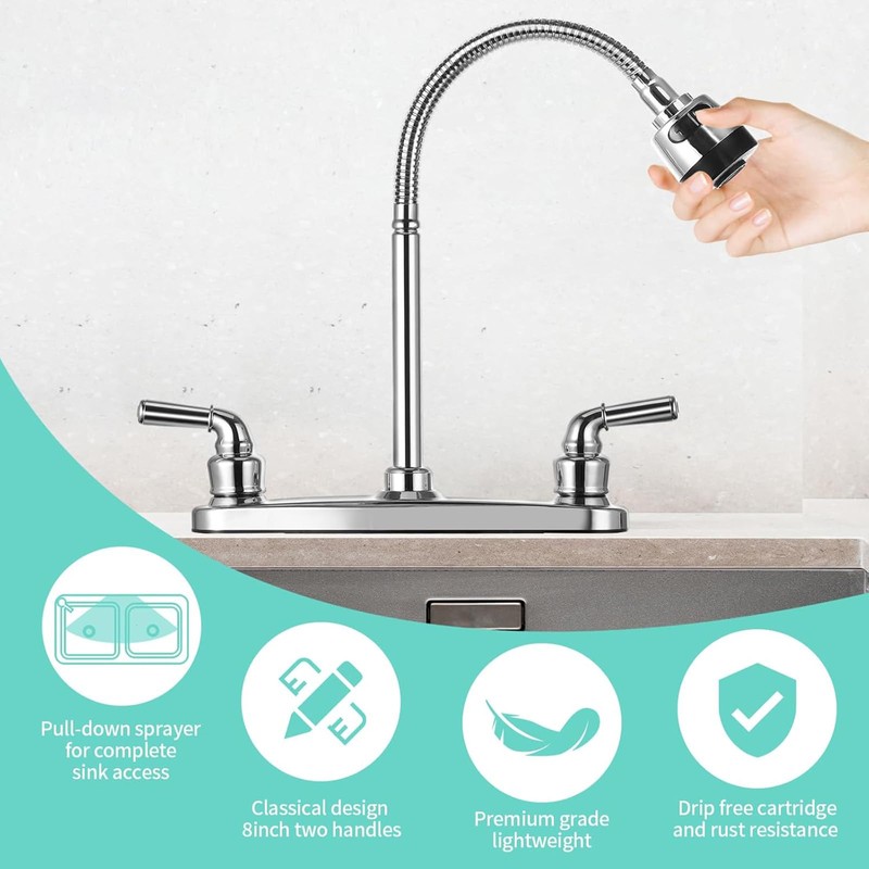 - 【Diseño de Doble Asa】Los grifos de cocina de dos manijas son duraderos y de alto rendimiento. Acabado cromo espejo: Tiene mayor brillo y resistencia. Cartucho de latón, Cuello de acero inoxidable, Cubierta de plástico.El diseño de 2 manijas del grifo de la cocina proporciona un control completo para encontrar la temperatura ideal del agua.