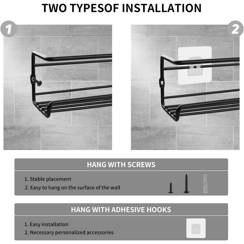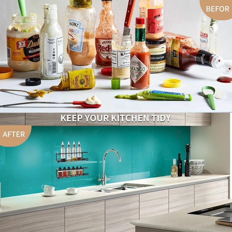 - Two installation methods: self-adhesive hooks and screws. You can choose two different ways to install it according to the actual situation. The hanging spice rack is easily removable for cleaning.