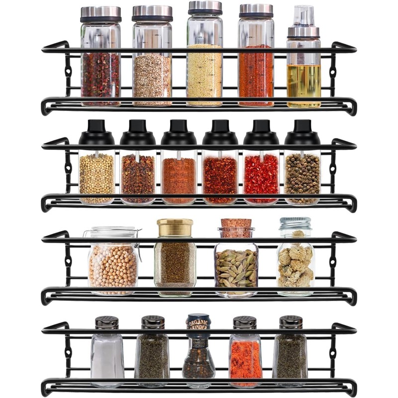 Mezzar Spice Rack Wall Spice Rack Hanging Metal Spice Holder No Drilling Fridge Organiser Kitchen Shelf Pack of 4 Black