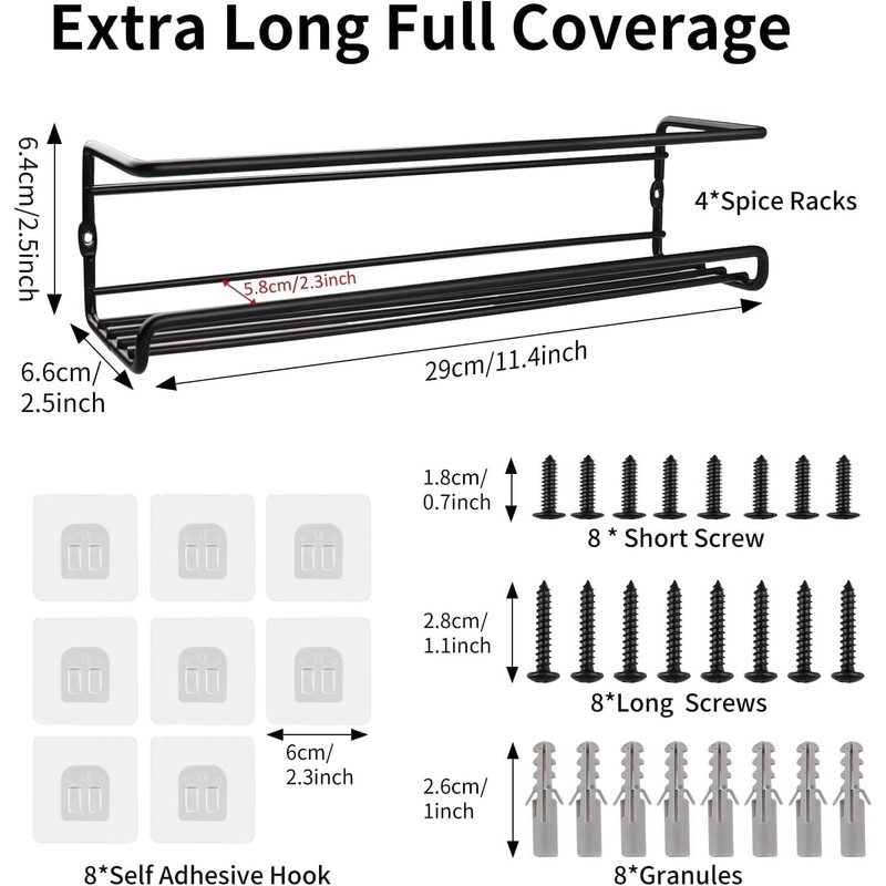 - Flexible placement: each metal spice rack size: 29 x 6.6 x 6.4 cm. The four spice holders can be used more flexibly and placed in any corner of the kitchen. Spice rack wall makes your kitchen cleaner and tidy.