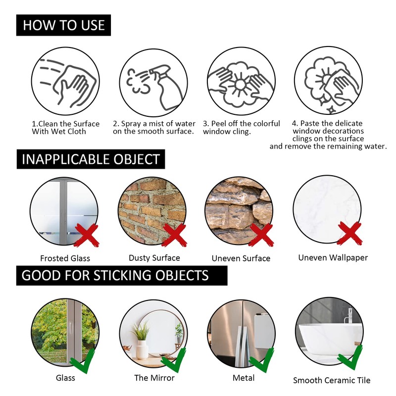 - Easy to Use: These window decors are thin static clings, which do not require additional glue or tape, and can be easily attached to a smooth and dry surface. Just remove the sticker and paste it on the surface of cars, trucks, glass, mirrors, windows, glass vandal-proof doors and bathroom surfaces; and use a card to squeeze out air bubbles from top to bottom. It is easy to attach to your window and remove without leaving sticky residue