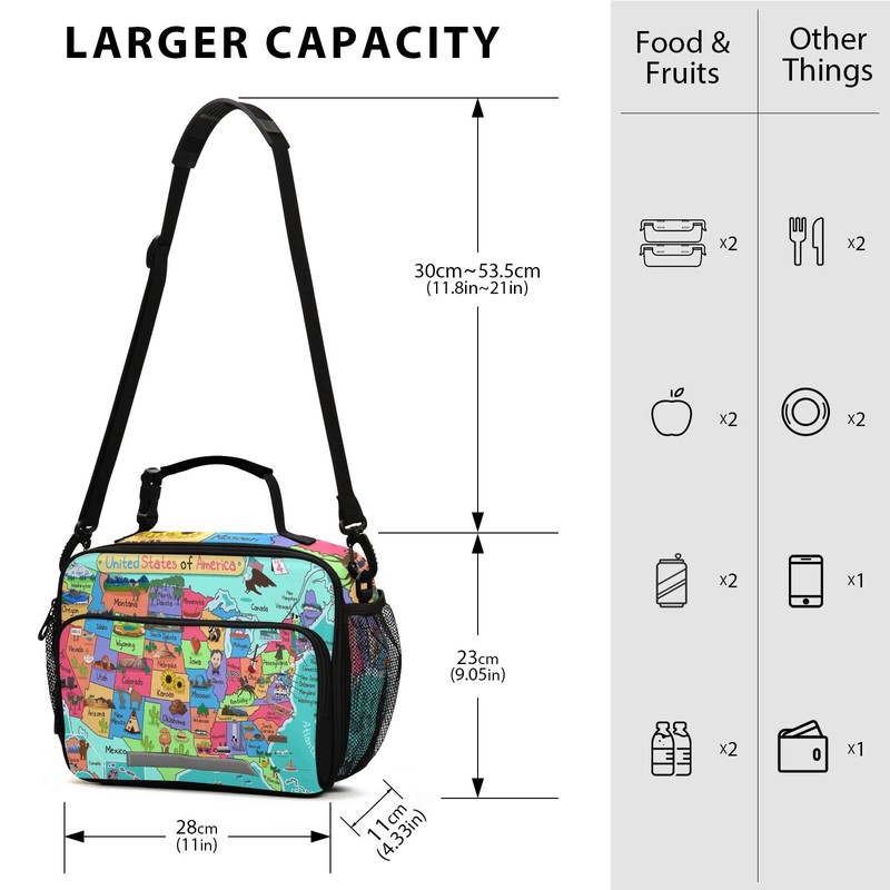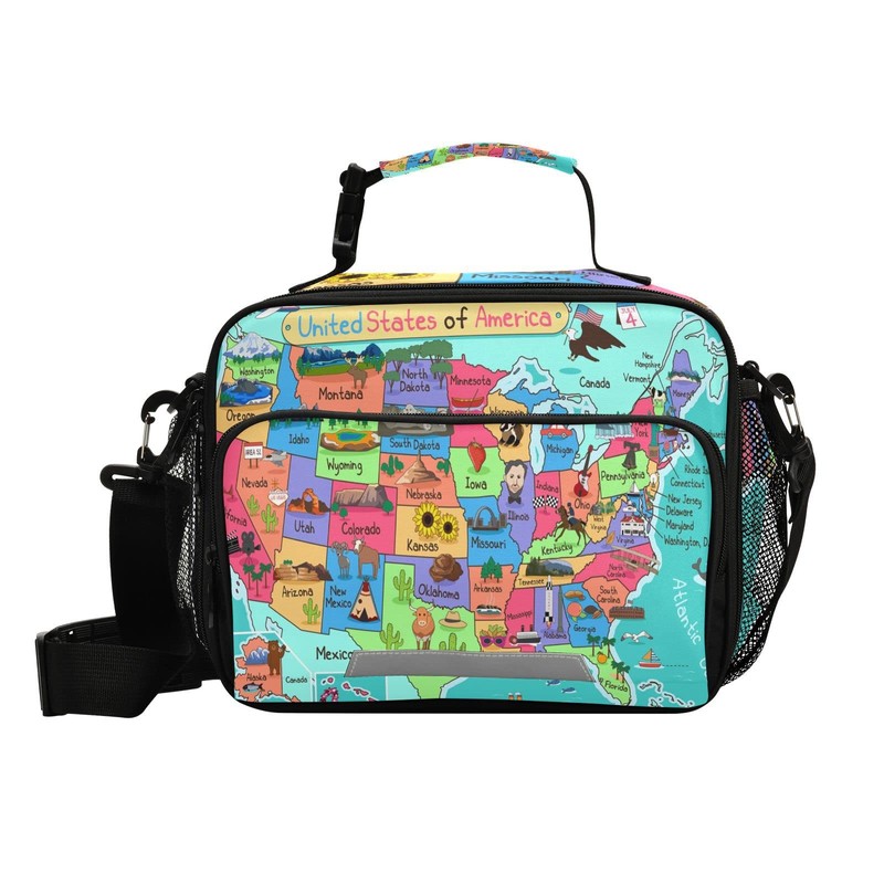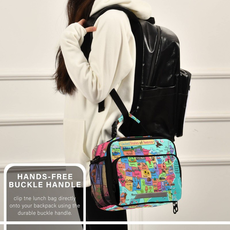 MFTJYO Animal World Map Lunch Box for Girls Boys United States Map Insulated Cooler Bag Kids Reusable Lunch Bags for School Lunchbox Tote Bag Adjustable Shoulder Bag Work Picnic
