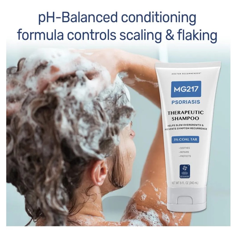 MG217 Therapeutic Shampoo para psoriasis contiene alquitrán de hulla al 3%, recomendado para aliviar síntomas persistentes como escamas, picazón y enrojecimiento en el cuero cabelludo. Es un tratamiento clínico efectivo y aprobado para uso frecuente.