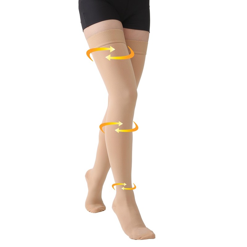 - All Day Comfort: Silicone grip dot-top lining prevents rolling and slipping, which helps the thigh high support socks stay in place all day; High-quality medical fabrics - 70% Nylon, 30% Spandex - air-covered spandex thicker yarn soft touch, comfortable all day wear. Roomy closed toe box will not compress toes and eliminates pressure and chaffing on sensitive feet; Moderate Support, Unisex Thigh Highs, Doctor-recommended, MGANG 20-30 mmHg graduated compression thigh high support stockings!