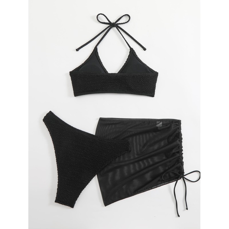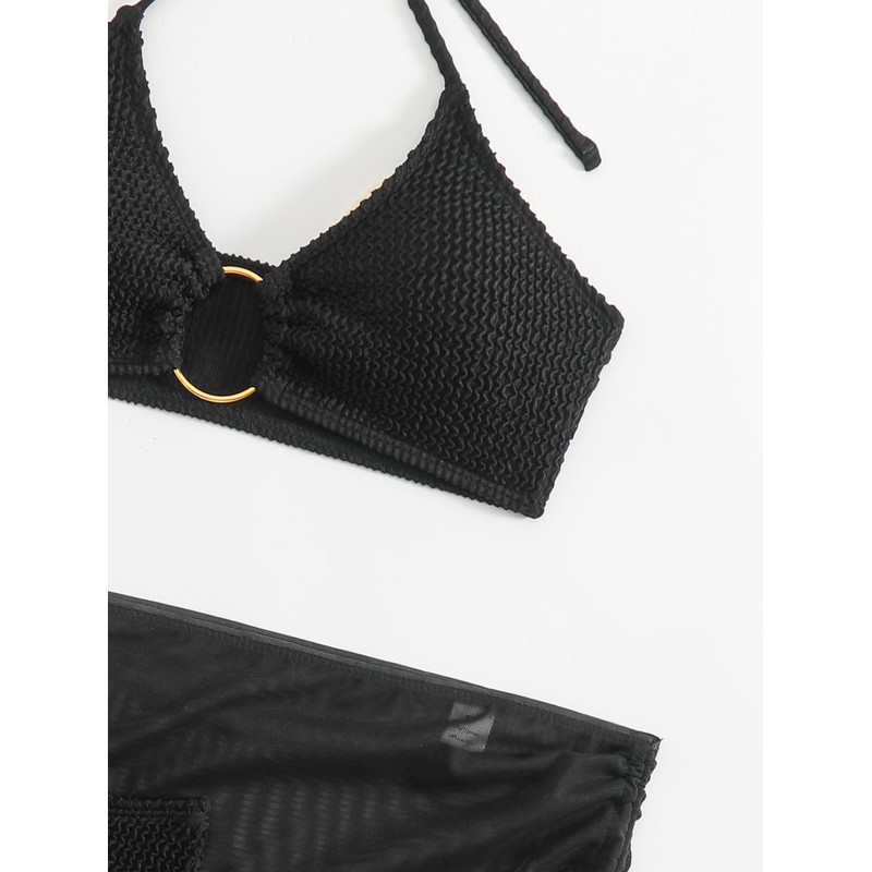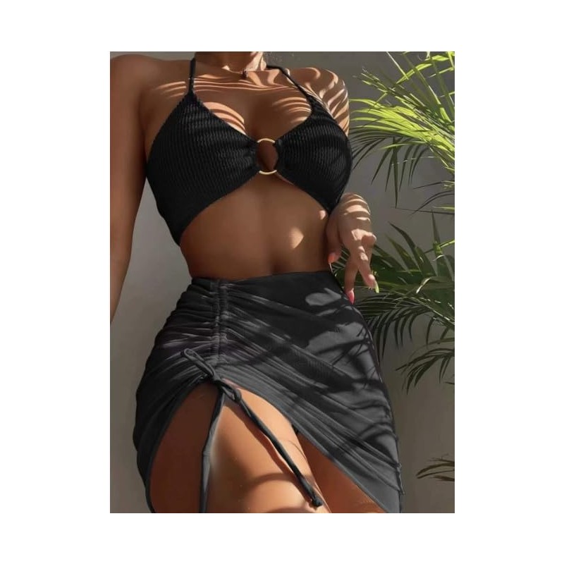 - Versatile Three-Piece Set: Includes a bikini top, high-waisted swim skirt, and a mesh sarong, providing multiple styling options for various occasions.