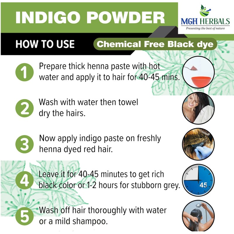 - 100% NATURAL, PURE and ORGANIC - Best Indigo powder for hair has no added chemicals, dyes, or perfumes. MGH Herbals Indigo Powder used along with our Henna powder is safe for use on all kinds of hair; NATURAL HAIR COLUR for both Female and Male - Natural indigo powder for hair to get different tones such as Black, Brown, dark brown etc. Neli Aku or Neela Amari powder gives natural and attractive color to hair and beard without any chemicals