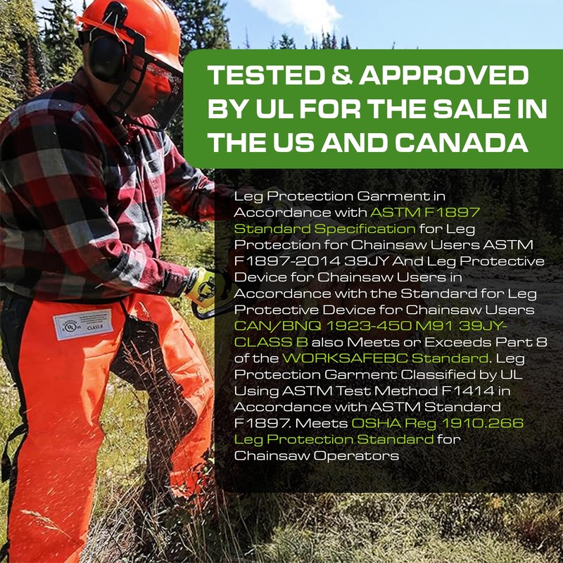 • SUPERIOR SAFETY & DURABILITY – Made from heavy-duty 1200 Oxford polyester with a 4-ply protective layer, MGP Supply chainsaw chaps meet OSHA 1910.266 standards for chainsaw operators, ASTM F1897 specifications for leg protection, and CAN/BNQ 1923-450 M91 39JY CLASS B safety standards.