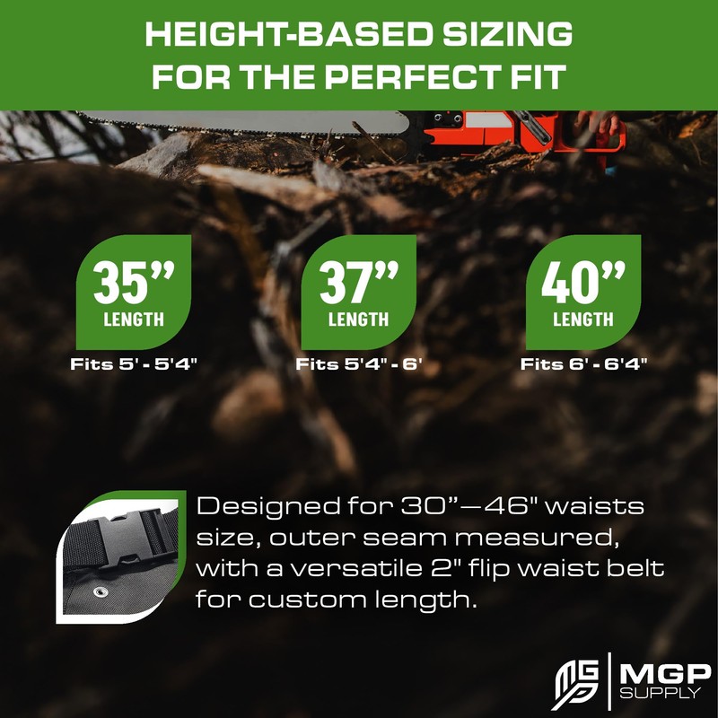 • APRON-STYLE – Designed for waist-to-ankle safety, our chainsaw chaps for men feature an adjustable waist (30”-42”) and secure leg belts for a custom fit. Featuring a deep utility pocket for tool storage, they come in orange and black in length sizes 35”, 37”, and 40”.