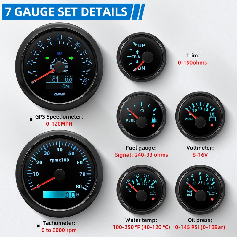 - 【7 Gauge Set】Range- GPS Speedometer: 120 MPH, Tachometer: 0 - 8000 RPM, Oil Pressure: 0 - 145 PSI (0 - 10 BAR), Fuel Level: E - 1/2 - F (signal: 240-33 ohms), Water Temperature: 100 - 250 °F (40 - 120 °C), Volt: 8 - 16 V, Trim Gauge: 0-190ohms