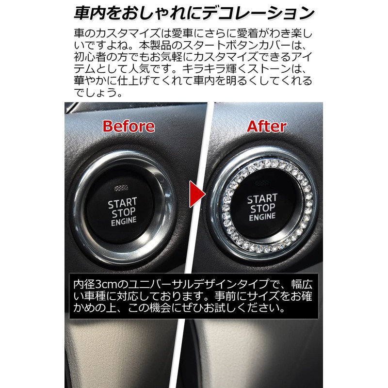 - Decorate your car in a stylish way: Customize your car with more enjoyable attachment to your vehicle. This start-button cover is popular even for beginners. Sparkling stones will brighten up your car with a gorgeous finishing touch! Universal design type with an inner diameter of 1.2 inches (3 cm), fits a wide range of vehicles. Please check the size beforehand and give it a try
