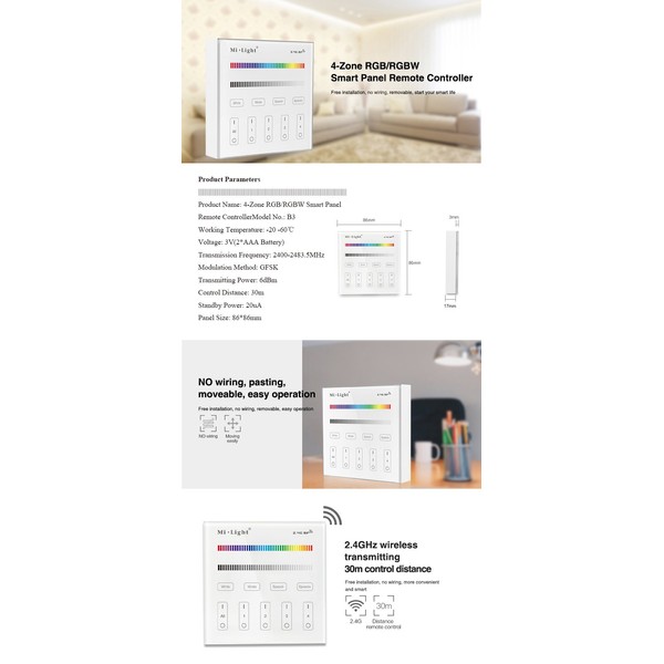 Product Name: Mi.Light B3 Wireless 2.4G RF 4 Zones RGB/RGBW Wall Mounted Smart Panel Controller Powered By 2pcs AAA Batteries Only Work With Mi.Light RGB/RGBW Series The Newest Version LED Lights,Strip Controller Model No.: B3 Working Temperature: -20 -60℃ Voltage: 3V(2*AAA Battery)NOT included **AC 90-120V Type ASIN:B01N2WO0E0** Transmission Frequency: 2400-2483.5MHz Modulation Method: GFSK Transmitting Power: 6dBm Control Distance: 30m Standby Power: 20uA Panel Size: 86*86mmList of our shop products can be controlled by this panel controller:ASIN B01N9TPFPQ,B01N56ZGPJ. **This panel controller ONLY work with Mi.Light THE NEWEST RGB and RGBW series LED bulb,downlight and strip controller!!!** If you're not sure your product is the newest type or not,please contact us for support,Thanks! **It would NOT work with the old version bulb,downlight and strip controller!!!** Even you have the same product as the listing in our shop,but we're not sure yours is the newest version or not,so please contact us before buying.Thanks! **The way to confirm your lamp is the newest version or not:** 1.If your RGBW lamp work with RGB+CCT remote,then it's the newest version. 2.If RGB+CCT remote mode in APP can control your RGBW lamp,then it's the newest version.