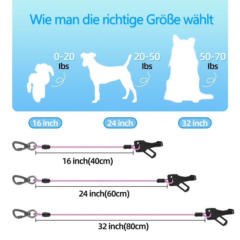 - Universal compatibility: designed to be compatible with most vehicles. Dog car seat belt are available in 3 different sizes: 16 inches (40 cm), 24 inches (60 cm), 32 inches (80 cm). You can choose the right size to limit the space for your dog in the car.