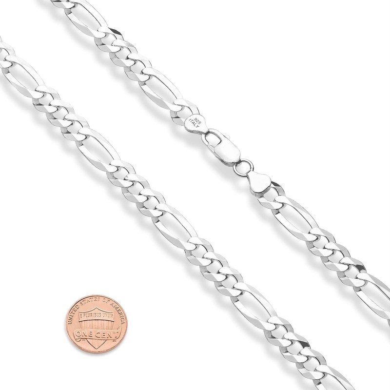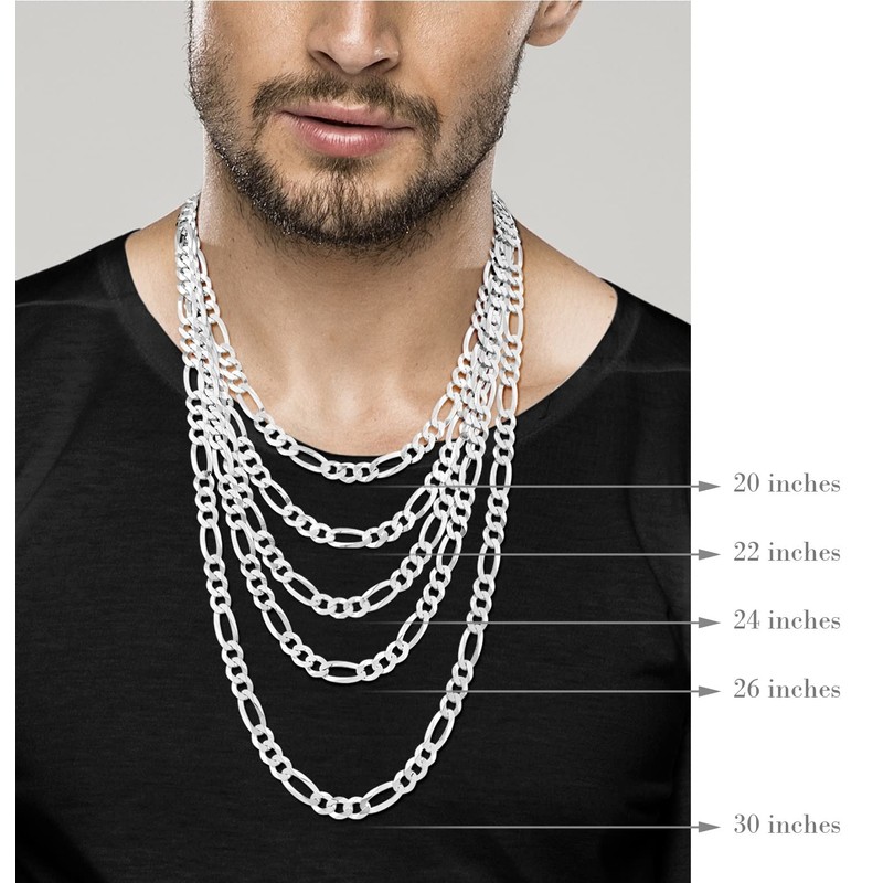- ITALIAN LUXURY - Amp up the masculinity with our bold sterling silver 9mm solid heavy Figaro chain. Made in Italy, this chain is strong, durable, comfortable and meant to endure daily wear. Flat diamond-cut beveled links create a rich look and perfect shine. Give a modern urban edge to a casual t-shirt, hoodie or formal outfit. Wear solo for an everyday polished look or add a favorite pendant or charm for a cool personal statement. Visit our store for a full selection of Figaro Curb chains.