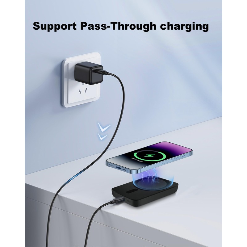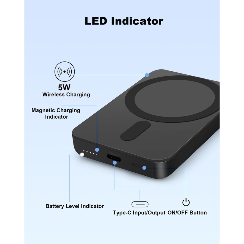 - USB-C Input/Output: This 5000mAh MagSafe-compatible battery pack comes with a USB-C port. It automatically detects your device and provides efficient charging with an output of up to 12W. The USB-C input can fully recharge the battery in just 4 hours using a 5V 2.0A adapter.