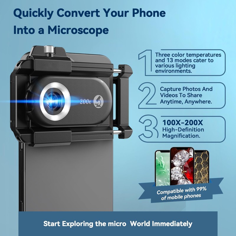 - 100X/150X/200X Magnification Our phone microscope, with its universal clamp design, can be easily attached to any smartphone. By zooming in your phone camera, you can get a full-screen image and achieve 100x/150X/200X magnification when combined with your phone's magnification function. Simply clip the microscope onto your phone to capture and share every micro moment.