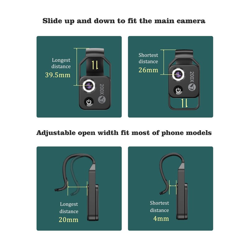 - UP to 200X MagnificationOur phone microscope with universal clip design can be easily clipped on your phone,you need to zoom in your phone camera to get full screen image, once cooperate with your mobile phone magnification function to achieve 200 times magnification. Simply clip this cell phone microscope on your phone, you can record every micro moment and share with your friends.