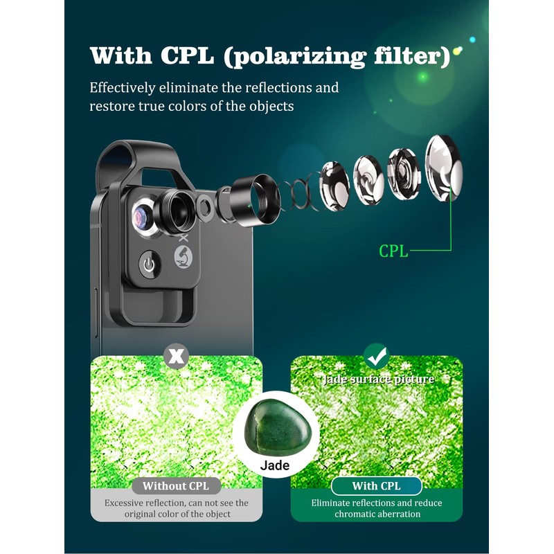 - With CPL LENS EMBEDED With deeply research about microscope on market, We find out once combine microscope with CPL lens so we will get more clear pictures. our portable phone microscope with CPL lens can eliminate unwanted glare and ghosting which easily get's compounded at long exposures,enable colors to become more saturated and appear clearer with better contrast under high power zoom