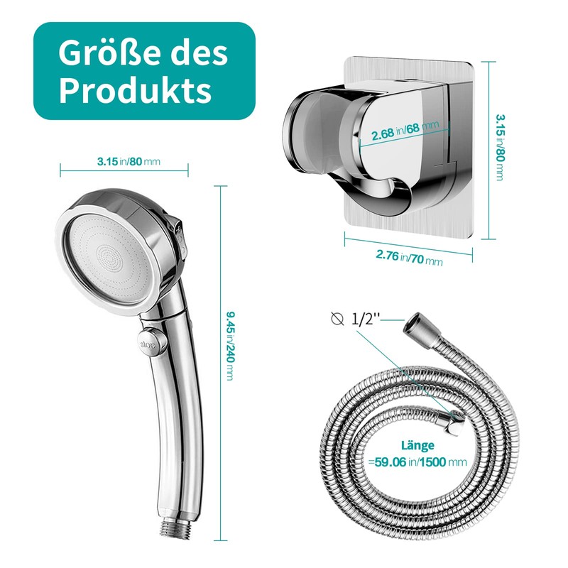 • Easy to install: The standard G1/2 inch interface design is suitable for most families. Tool-free connection takes minutes, no plumber required. This shower hose with shower head comes with a 150 cm stainless steel hose, tape, a self-adhesive shower holder and installation instructions. Simply follow the instructions to install the shower set.
