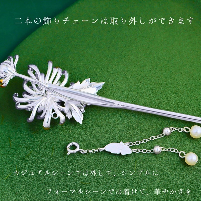 【使用シーン】訪問着、黒留袖、色無地、袴、振袖、等の着物に合わせて、また旅行先のレンタル着物、カジュアルな浴衣、和服コスプレのご使用時のワンポイントとして、パーティー、フォーマルなシーンや結婚式の洋装のまとめ髪や夜会巻き、にも活躍してくれます。友人とのお茶会やちょっとしたお出かけ、オフィスでのさりげないおしゃれには、チェーンを外してシンプルに。結婚式、卒業式、入学式、パーティーなどのフォーマルな場では、チェーンを付けて揺れるパールが華やかさを演出し、周囲の視線を集めます。また、お祭りや花火大会で浴衣に合わせれば、日本の情緒あふれる美しさを表現できるでしょう