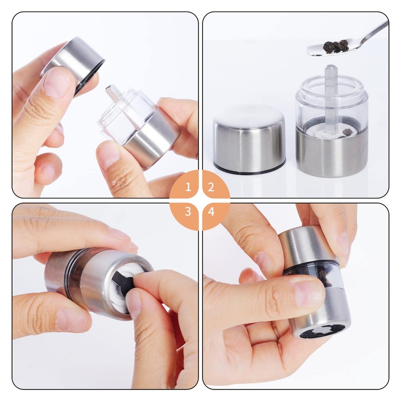 - Package Contents: 4 pcs salt and pepper grinder.The size is about 2.2inches in height,1.2inches in diameter. Each bottle is packaged with carton.