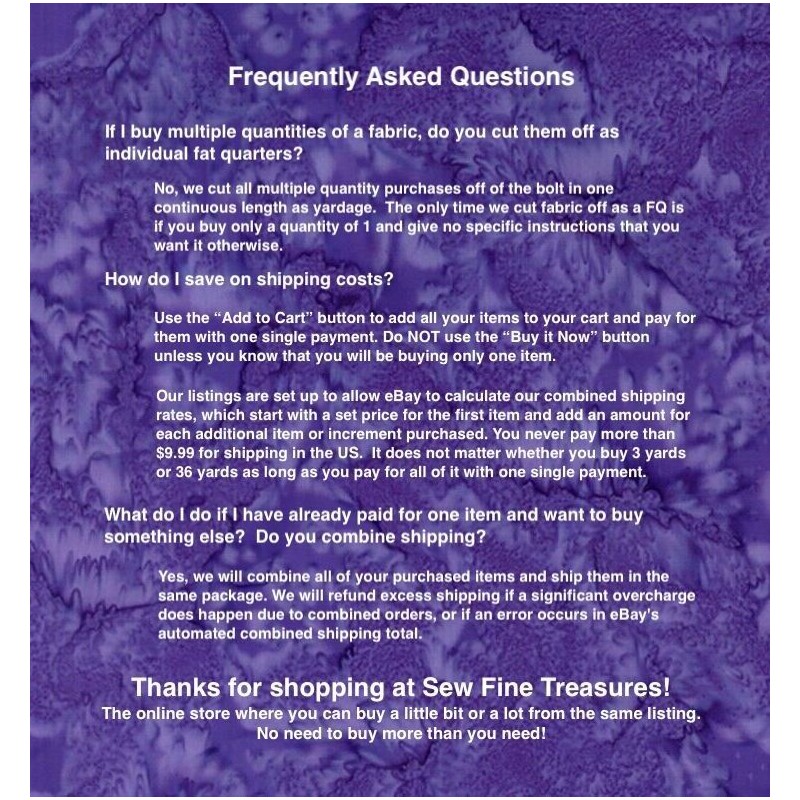 - Simply use the "add to cart" button to select all the fabrics you want to purchase instead of "buy it now" button. Add all of your selections to your cart before you go to checkout. You will save on shipping costs with our combined shipping rates. Payment is then appreciated within 24hours, but it is expected within a maximum of 4 days.