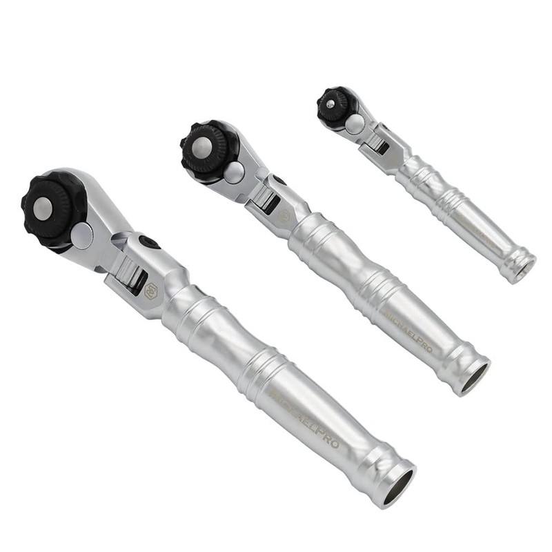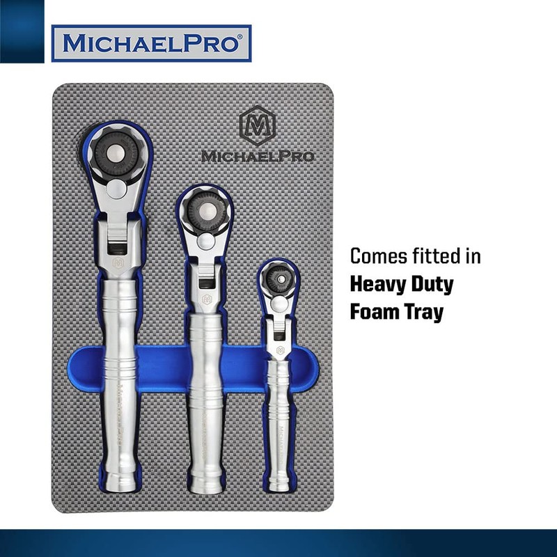 MichaelPro MP001210 3-Pc Multi-Position 72 Tooth Extendable Flex- Head Ratchets | 1/4", 3/8", 1/2" Drive | Reversible with Quick Release