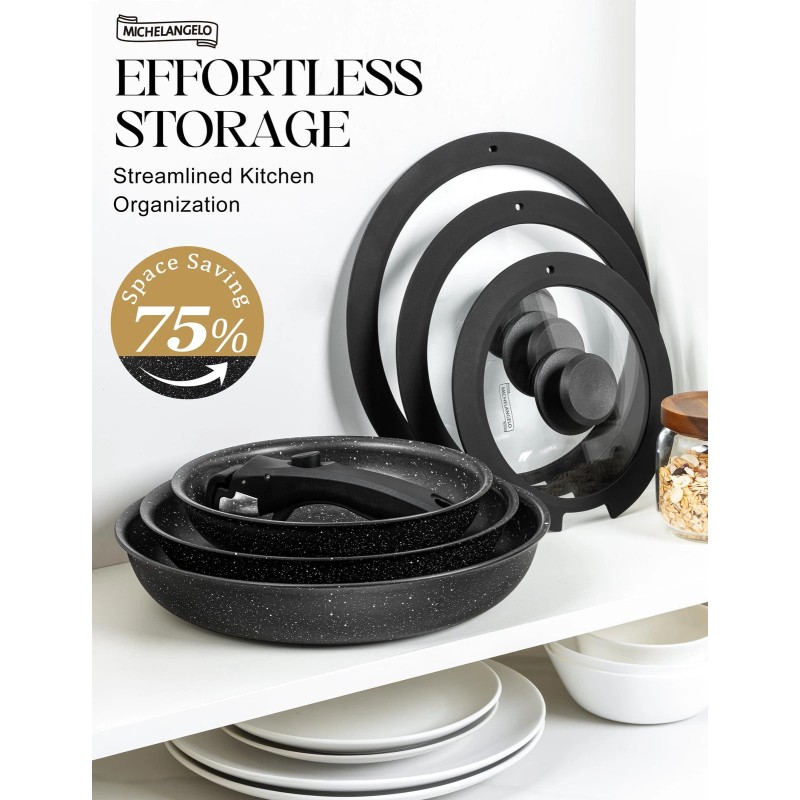 Save 75% Space: Optimize kitchen space with our space-saving design that neatly stacks all frying pans, reducing cabinet clutter by 75%. Perfect for compact kitchens or ideal for campers, this 3-piece frying pan set keeps your kitchen organized and tidy without compromising on functionality.