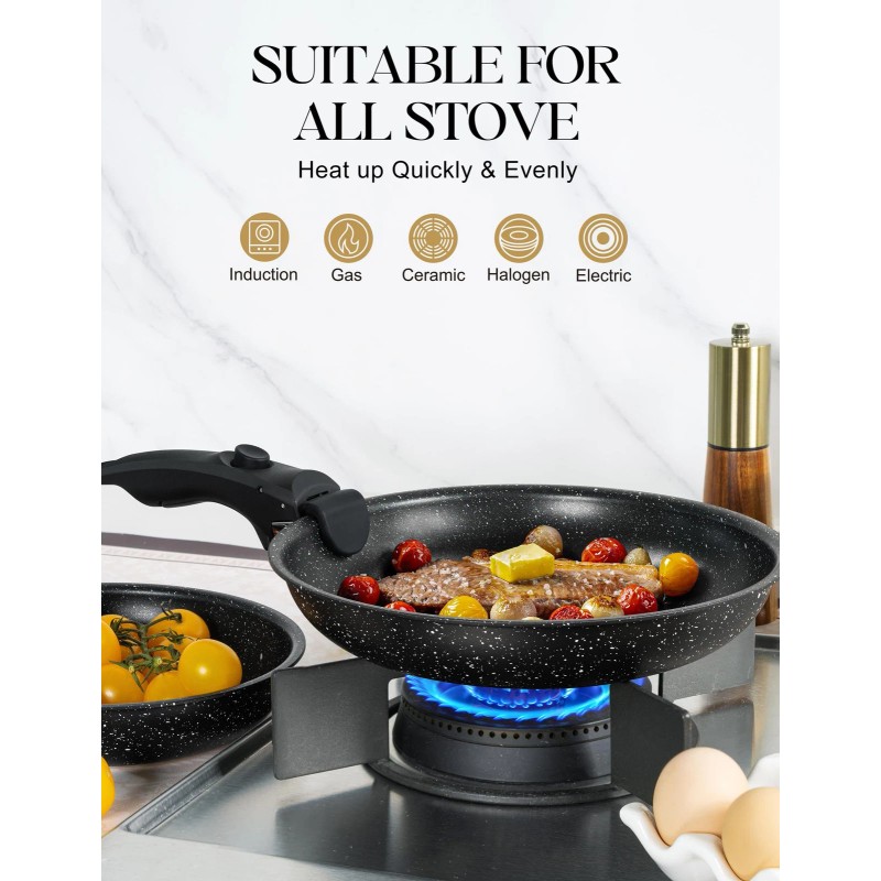 Healthy Granite Nonstick Coating: Prioritize your family's well-being with our 3 pcs fry pan set featuring a natural granite non-stick material. Free from Teflon, PTFE, PFAS, and harmful chemicals. The scratch-resistant, stain-resistant, and durable granite coating of removable handle frying pan set maintains an appealing black appearance even after extended use.