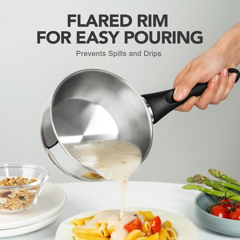 - Easy Pouring Design: Our sauce pan features a flared rim for easy and spill-free pouring. This thoughtful design keeps your kitchen clean and adds convenience to your cooking routine, making it an essential piece in your stainless steel pot set.
