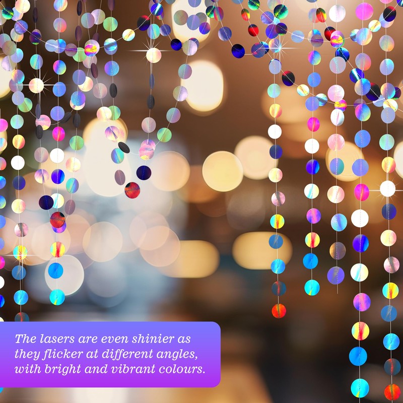 - 【Papier Girlande Glitzer Runde Set】Das Hängende Iridescent Garland Set enthält fünf separate Girlanden mit je 4 Metern Länge und 56 bunten Glitzerkreisen (Durchmesser 5 cm). Die Kreise sind in verschiedenen Regenbogenfarben gehalten und erzeugen unter Licht schillernde Effekte.