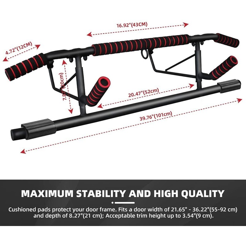 ☛EASY TO INSTALL: No screws or other tools are needed. You only need a door frame at home to use this product. It is recommended for people weighing less than 220 pounds to use this product, if the home has a wooden door frame. The top of the home bar adds a ring so you can use it with other equipment.