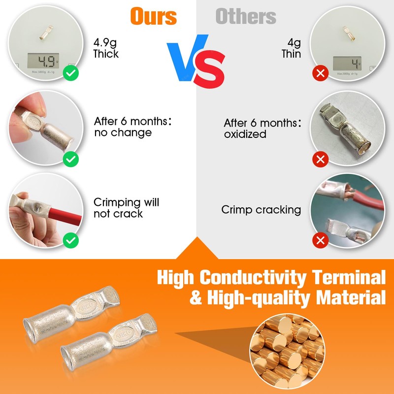 - High Conductivity - The terminals of these winch battery quick connect are made of high-conductivity silver-plated copper, ensuring stable voltage and current. Additionally, they are specially treated to prevent cracking during crimping