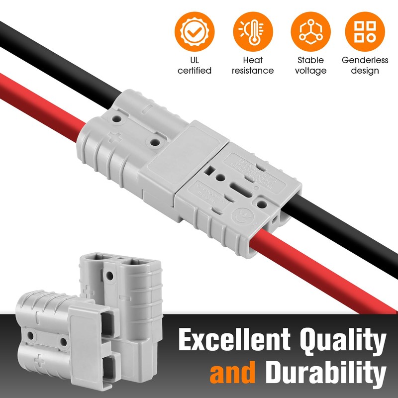 - Simple Installlation - Suitable for 8 AWG cables; voltage rating of 600V; capacity of 50 amps. Simply insert the cable into the terminal (diameter: 0.185 inches), solder or crimp the terminal, then slide the terminal into the plug and lock it into place for connection