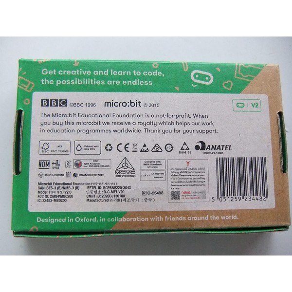 Exchange warranty for operating defects is 1 month from the delivery date. Meet the new BBC micro:bit Now with speaker and microphone! Same great features, easier ways to use sound and touch to get creative in the classroom Microphone Speaker, Micro USB User Buttons External Supply Analogue / Digital I/O LED Matrix 5 Touch Sensitive Logo, Kit Contents: Microbit V2.21 (Certified for construction design); Technical Standards are listed on outer box); USB cable, battery box, 2 AAA batteries, Quick Start Guide *Micro bit V2.21 unit color cannot be specified Specifications: MC. U:32bit ARM Cortex M4 Base Nordic nRF52833 64MHz 128KB Flash Memory: 512KB Interface Sensor: 25 x LED (can also be used as brightness sensor) 2 x Button Switch 1 x Touch Sensor (logo) 1 x Speaker 1 x Microphone 1 x Acceleration Sensor x Magnetic sensor 1 x Battery Connector (JST PH 2pin) 3 x I/O Ring 20 x Edge I/O Connector (GPIO, PWM, i2C, SPI...) 1 x Edge Power Connector (3V, GND) Bluetooth 5.0, BLE (near-field radio communication standard) Construction Design Certification Number: 018-200318