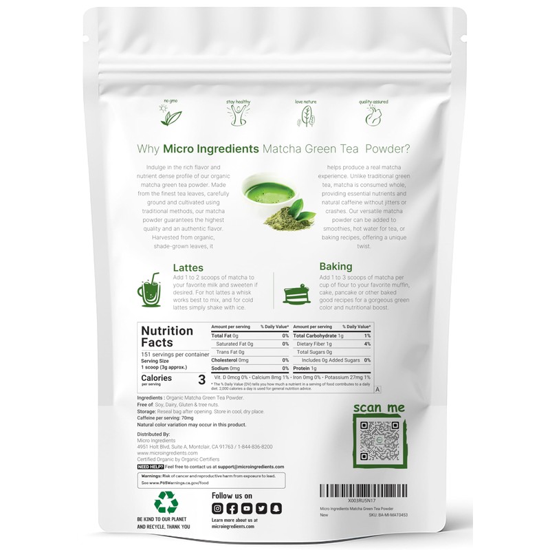 - Micro Ingredients Organic Matcha Tea Powder, Pure Matcha Powder Green Tea, 1 Pound, Culinary Grade and First Harvest Authentic Japanese Origin, Unflavored.