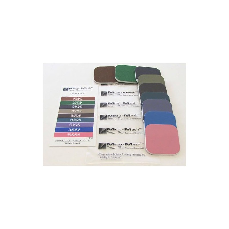 - The results are truly wonderful and will most definitely please the most discriminate of eyes. The pack includes 1 each 2 inch by 2 inch soft touch pads in the following grits: 1500, 1800, 2400, 3200, 3600, 4000, 6000, 8000 & 12000 plus a color coded grit guide.
