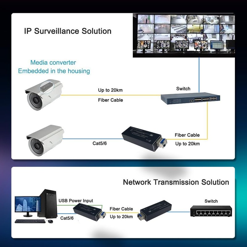 • SMSF 20Km SFP Module:The Ethernet media converter comes with single-mode single-fiber 1310/1550nm SFP module*2, can transmiting Ethernet up to 20km.