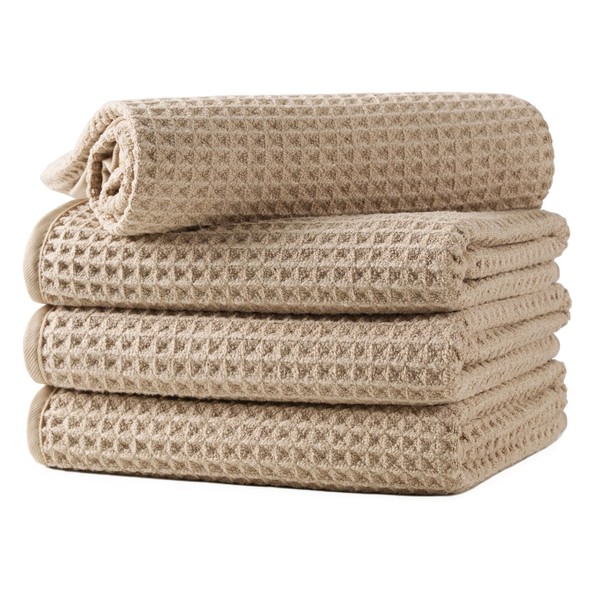 MICROFI Microfiber Waffle Hand Towels, 4 Pieces, Soft, Absorbent, Fast Drying, Lint Free (Beige)