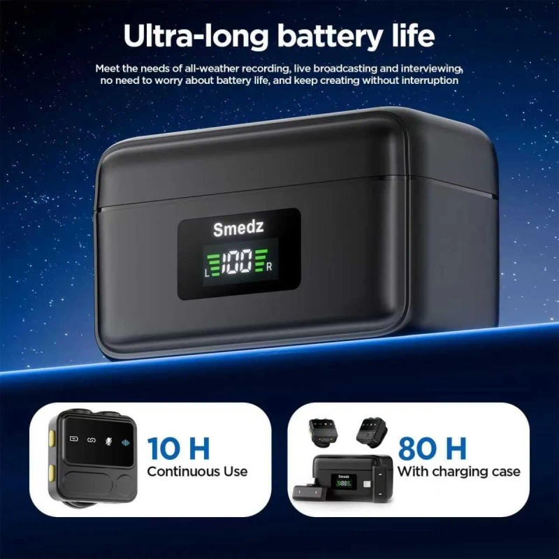 Batería de larga duración con pantalla inteligente: obtenga 10 horas de uso continuo con una sola carga completa y, con el estuche de carga incluido, prolongue el tiempo de grabación hasta 80 horas. La pantalla digital LED de la funda de carga muestra el nivel de batería restante en tiempo real, para que no te pille desprevenido un micrófono sin batería.