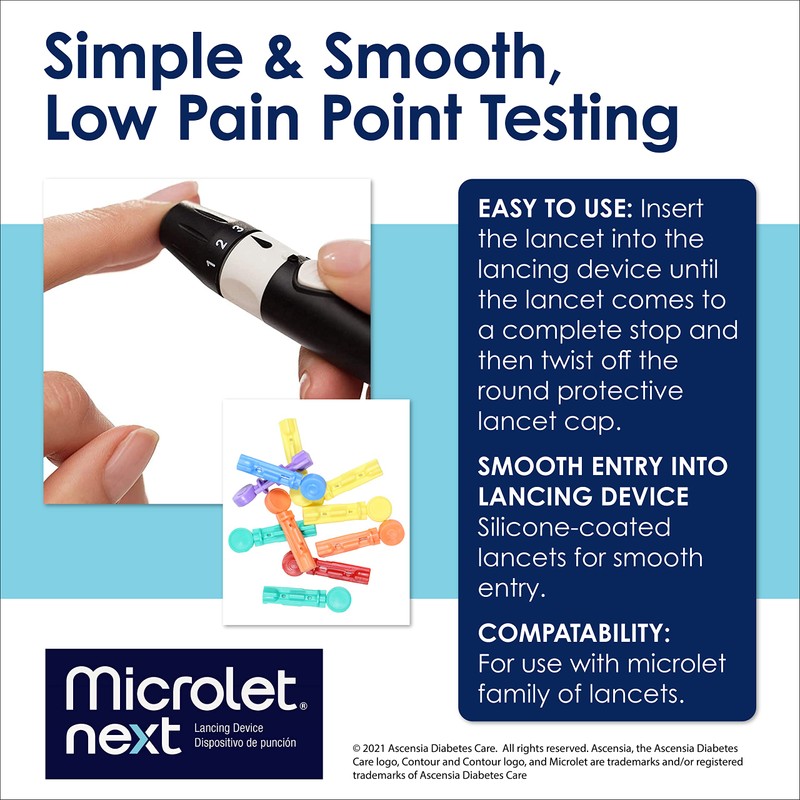 The easy-to-use MICROLET NEXT Lancing Device is designed to help minimize pain (1,2) so you can test with confidence at home or on-the-go. The MICROLET NEXT Lancing Device features 5 clearly visible depth settings and a locking endcap to prevent accidental lancing. MICROLET NEXT Lancing Device uses MICROLET silicone-coated lancets that glide smoothly into the skin. MICROLET NEXT Lancing Device also features a smooth gliding mechanism to minimize noise and help reduce pain perception. After use, the ejector button pushes the lancet out with no need to use your hand. Easy to use, MICROLET NEXT Lancing Device is as simple as preparing, lancing, and ejecting.