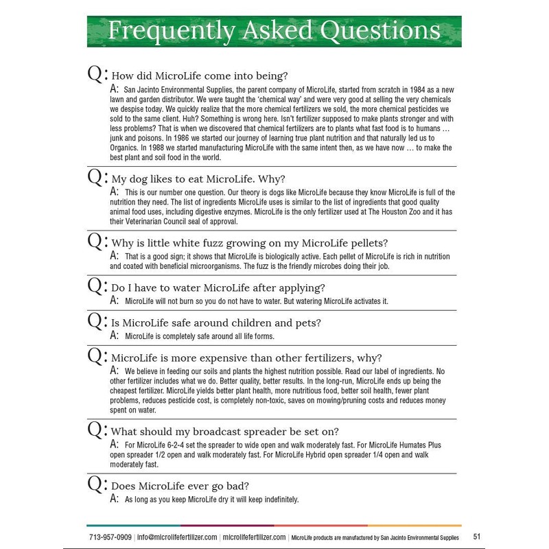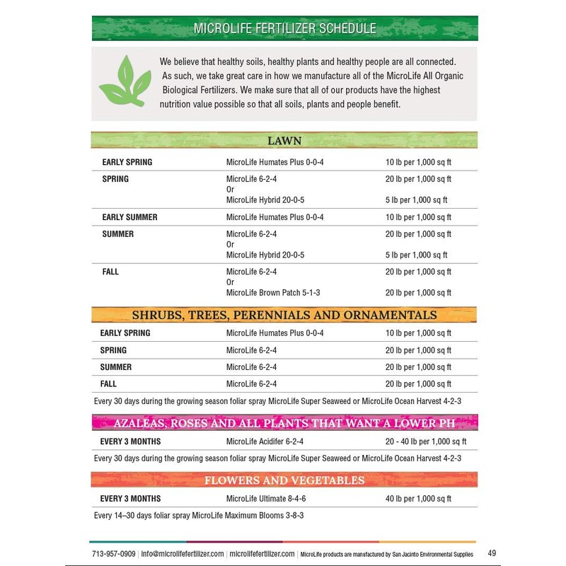 Extremely powerful, homogenous, granulated All Organic Biological fertilizer containing: Fish, Kelp, Molasses, Emery Humates, Rock Phosphate,Wheat Middling's, Soy Meal, Cottonseed Meal,Alfalfa, Corn Meal, Kmag, Potassium Sulfate, Iron Sulfate, 18 select Amino Acids, Folic Acid,Vitamins, plus the MicroGro Supreme Bio-Inoculant package which contains billions of beneficial microorganisms including Endo & Ecto Mycorrhizal. All ingredients are included in meaningful amounts. Improves all soils by feeding the indigenous microbes, adding billions more, by providing specific soil improvers like polysaccharides, humic acid, fulvic acid and the major building blocks of life. MicroLife 6-2-4 builds big root systems which further improves the soil and reduces water use. Rates: Turfgrass: 15 C 20 lb per 1,000 sq ft. Repeat every 3 C 4 months Ornamentals, Flowers,Veggies & Fruit: 20 C 40 lb per 1,000 sq ft. Repeat every 3 C 4 months Building Beds and Gardens: 40 lb per 1,000 sq ft worked into the soil Tree installations & Containers: 2.5 oz per 5 gal size. Repeat every 3 C 4 months