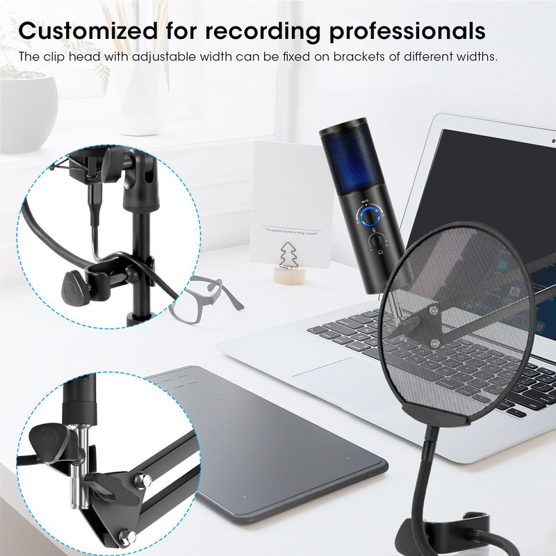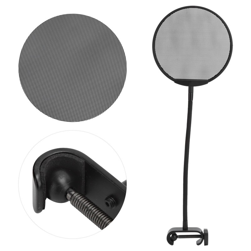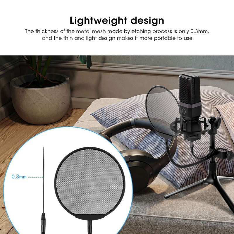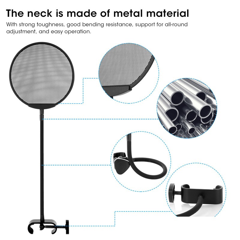 1、The thickness of the metal mesh made by etching process is only 0.3mm, and the thin and light design makes it more portable to use. 2、The fine mesh has better anti‑spray effect and better permeability, through the mesh, you can clearly see the working status of the microphone. 3、The design of the neck makes it easier for users to adjust the angle of use, which is customized for recording professionals. 4、The clip head with adjustable width can be fixed on brackets of different widths. 5、Steel mesh design, blowout and windproof more efficient, support 360‑degree barrier‑free rotation. 6、The neck is made of metal material, with strong toughness, good bending resistance, support for all‑round adjustment, and easy operation.
