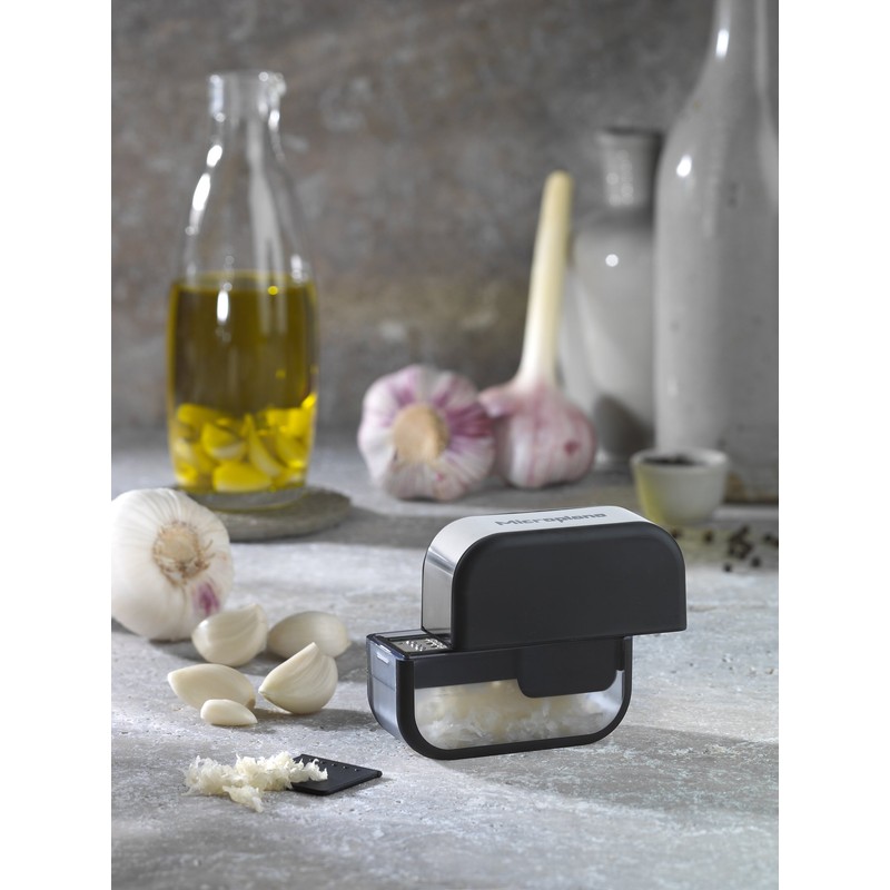 - Unlike a press, the garlic mincer produces finely textured garlic pieces